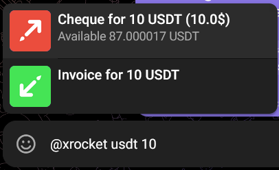 For example, type @xrocket 10 USDT @telegram_user to create 10 USDT cheque for the specified @telegram_user.