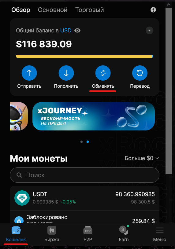 - В мини-приложении во вкладке Кошелек нажмите Обменять.