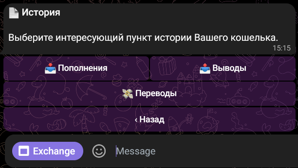 Перейдите в Главное меню бота > ⚙Настройки > История ваших действий и нажмите Депозит, Вывод или Переводы.