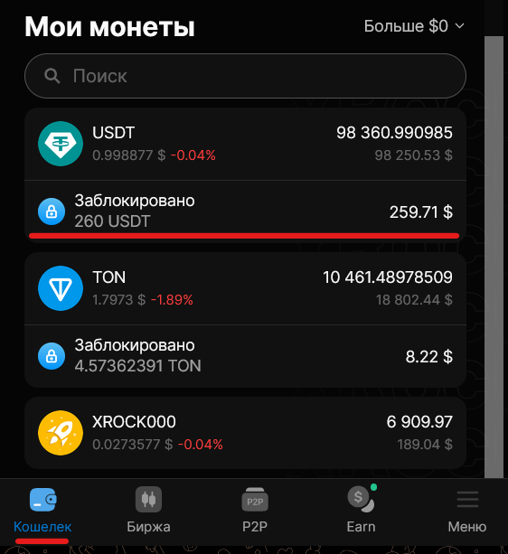 Иногда часть ваших средств в кошельке может быть заблокирована. Это означает, что они временно зарезервированы для одной из активных операций (чеки, ордера, P2P-сделки, вывод средств). Средства разблокируются автоматически после завершения или отмены операции.
