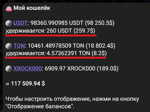 Вы можете просмотреть заблокированные активы на странице Мой кошелек в боте или на вкладке Кошелек в мини-приложении.