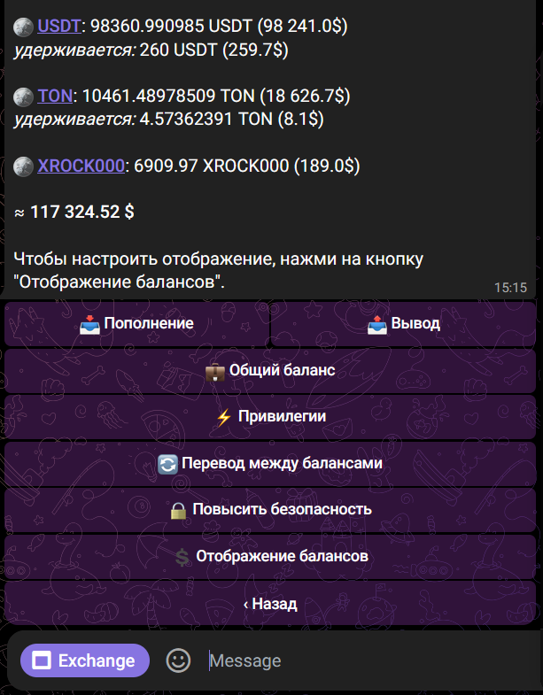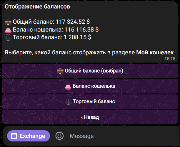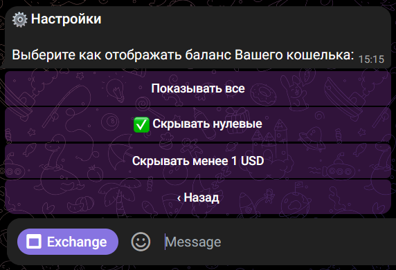 Настройте этот фильтр в Главном меню бота > ⚙Настройки > Отображение балансов или в меню мини-приложения, доступ к которому можно получить, нажав на фильтр рядом с отображаемыми цифрами баланса.