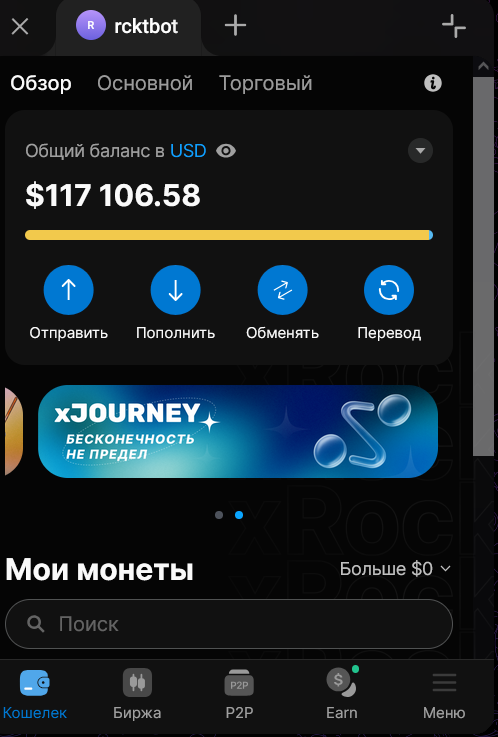 Кошелек xRocket имеет два типа балансов: Основной (Funding Balance) и Торговый (Trading Balance). Общий баланс (Total Balance) -- это суммарное значение этих двух балансов.
