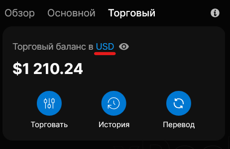 Переключайтесь между Основным, Торговым или Общим (агрегированным) балансом, рассчитанным в предпочитаемой вами валюте по умолчанию.