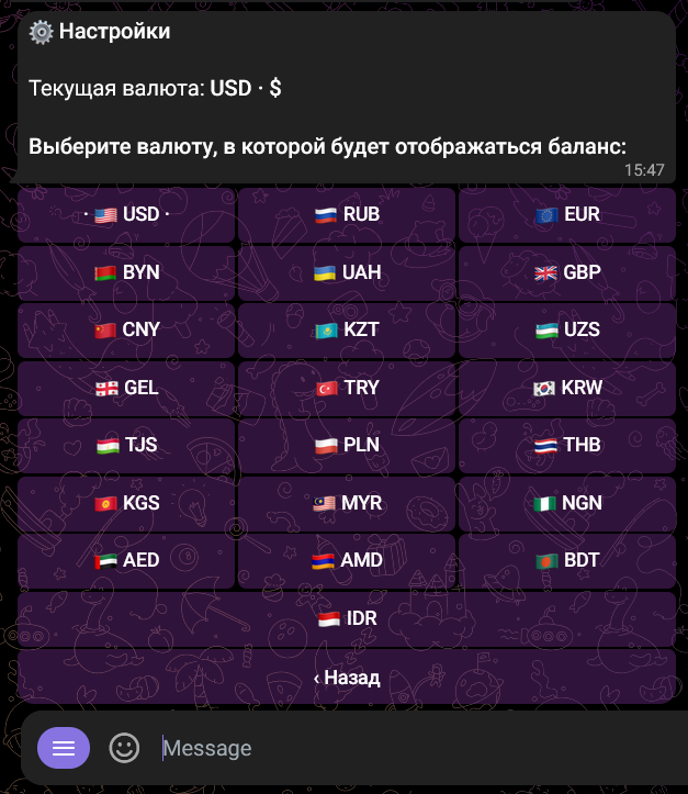 Выбирайте валюту по умолчанию в главном меню бота > ⚙Настройки > Валюта бота или в меню мини-приложения, нажав на название валюты рядом с отображаемым балансом.