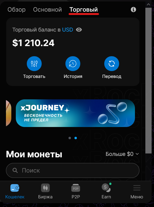 - Торговый баланс используется для спотовой торговли на бирже и предназначен для размещения ордеров.
